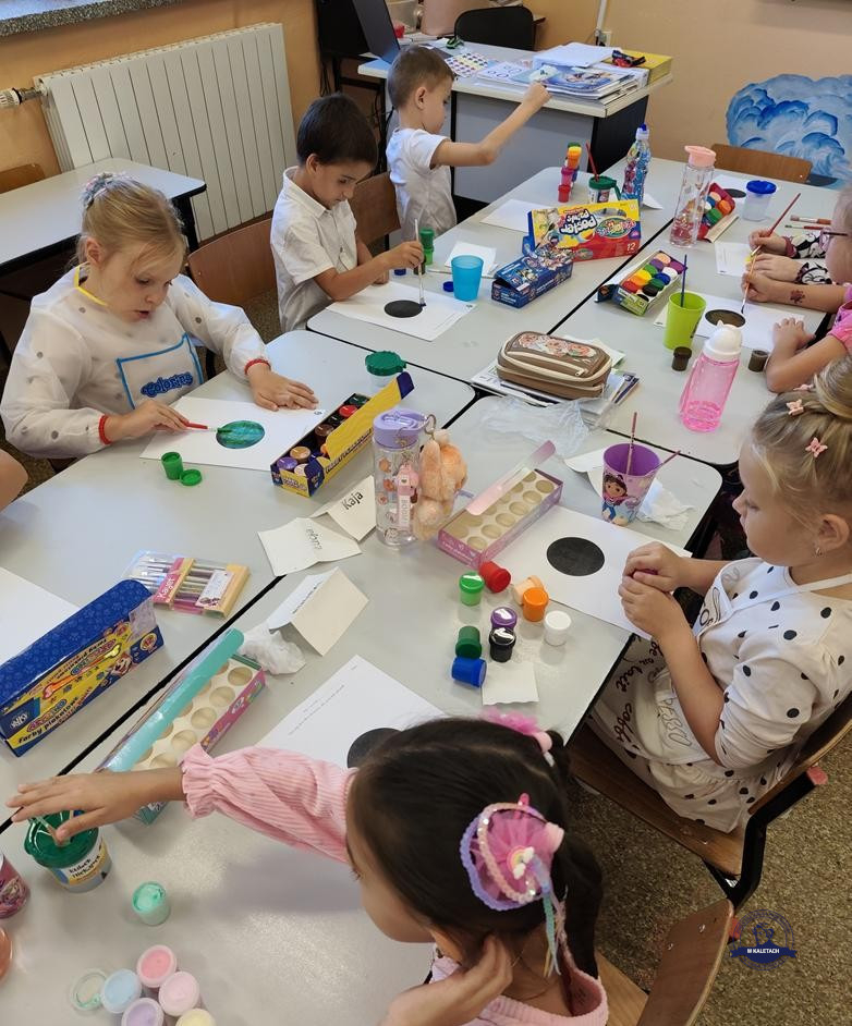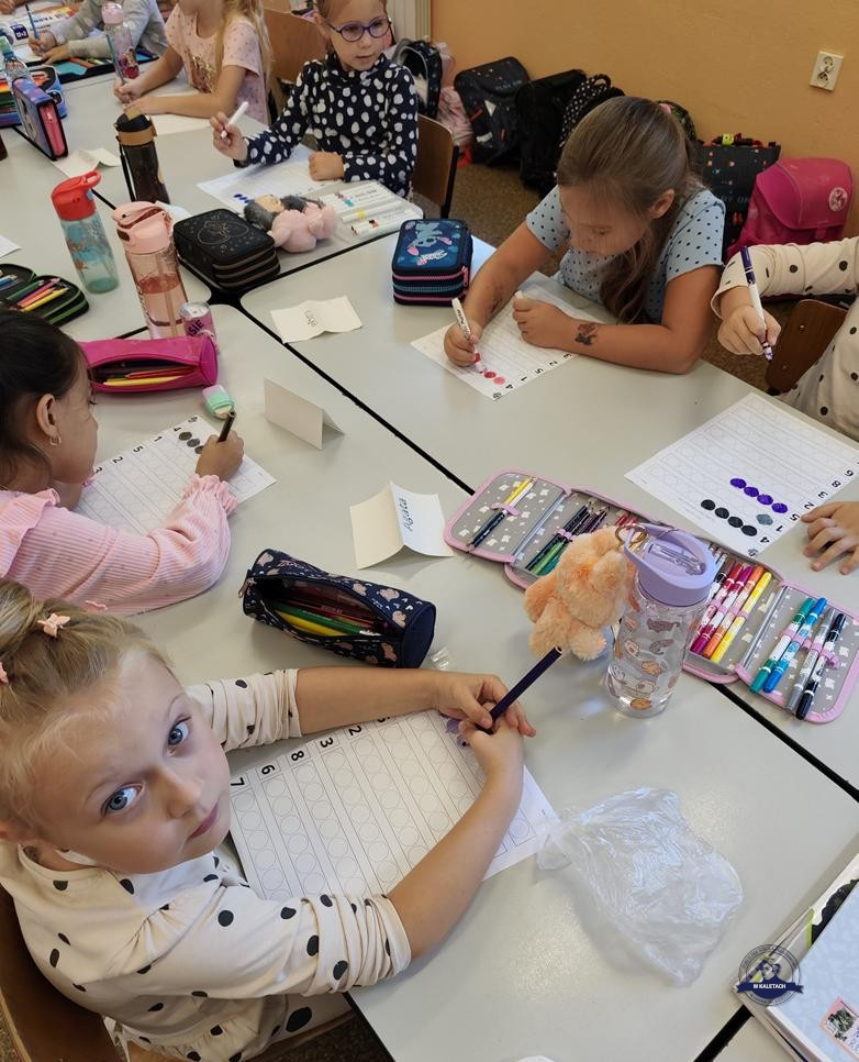 Później każdy otrzymał kartkę z dużą czarną kropką i tworzył z niej własne, wyjątkowe dzieło. Wspólnie poznaliśmy też wesołą piosenkę o kropce, która dodała naszym pracom jeszcze więcej radości i kreatywnej atmosfery. Na zakończenie bawiliśmy się matematyką z kropką.