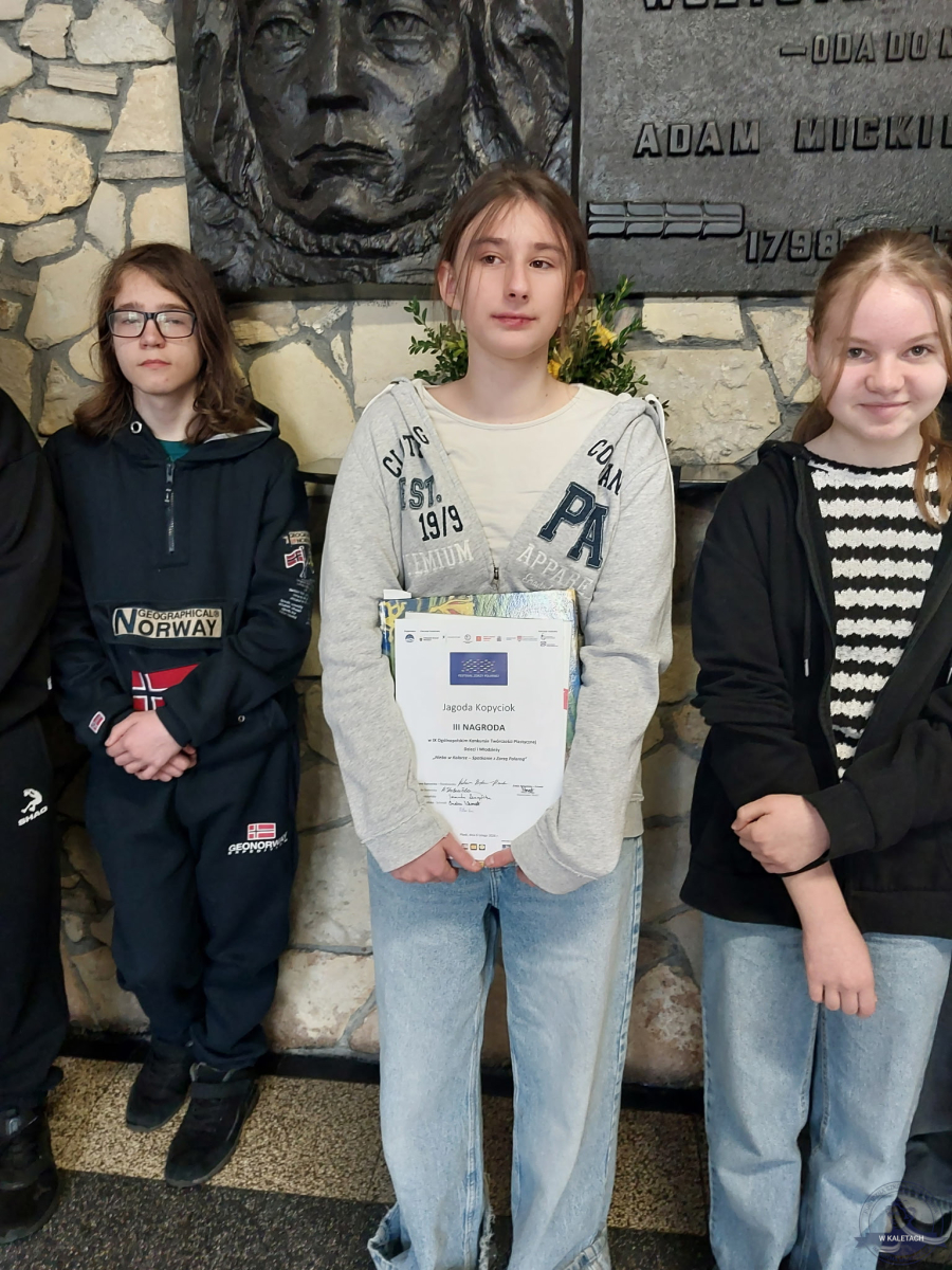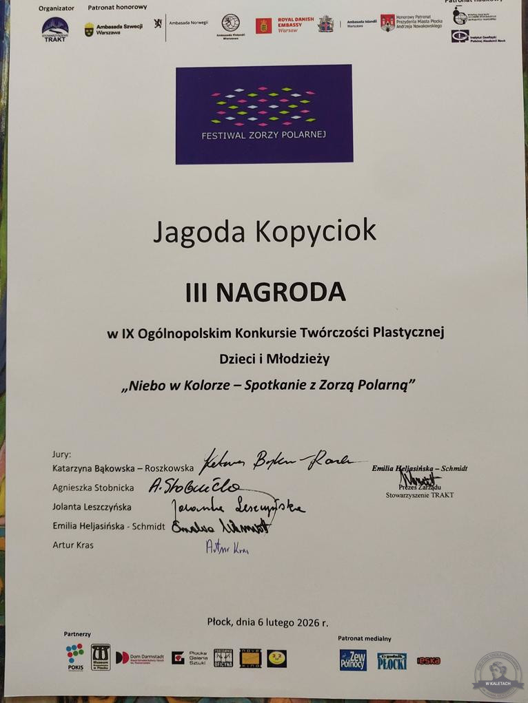 Uczennica klasy VIII c Jagoda Kopyciok znalazła się wśród laureatów Ogólnopolskiego Konkursu Twórczości Plastycznej Dzieci i Młodzieży „Niebo w Kolorze – Spotkanie z Zorzą Polarną”. Do konkursu wpłynęło 1758 prac plastycznych, prace konkursowe były wykonane w różnych technikach, prezentują zorzę polarną, a także środowisko terenów położonych poza kołem podbiegunowym. Konkurs odbywał się w ramach projektu edukacyjno — artystycznego Festiwal Zorzy Polarnej. To kontynuacja wieloletnich działań o charakterze edukacyjno – artystycznym, adresowanych do dzieci i młodzieży i poświęconych Skandynawii, w tym zwłaszcza Laponii, a także Islandii oraz Arktyce Wysokiej (Svalbard, Grenlandia). Obrazy przesłane na konkurs prezentują zorzę polarną, a także środowisko terenów położonych poza kołem podbiegunowym.